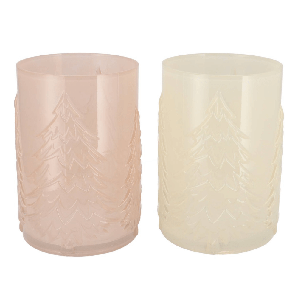 De Cozy Sand Frosted Windlichten zijn sfeervolle glazen houders met matglas en een winters dennenboom-reliëf. Perfect voor waxinelichtjes of kleine stompkaarsjes.