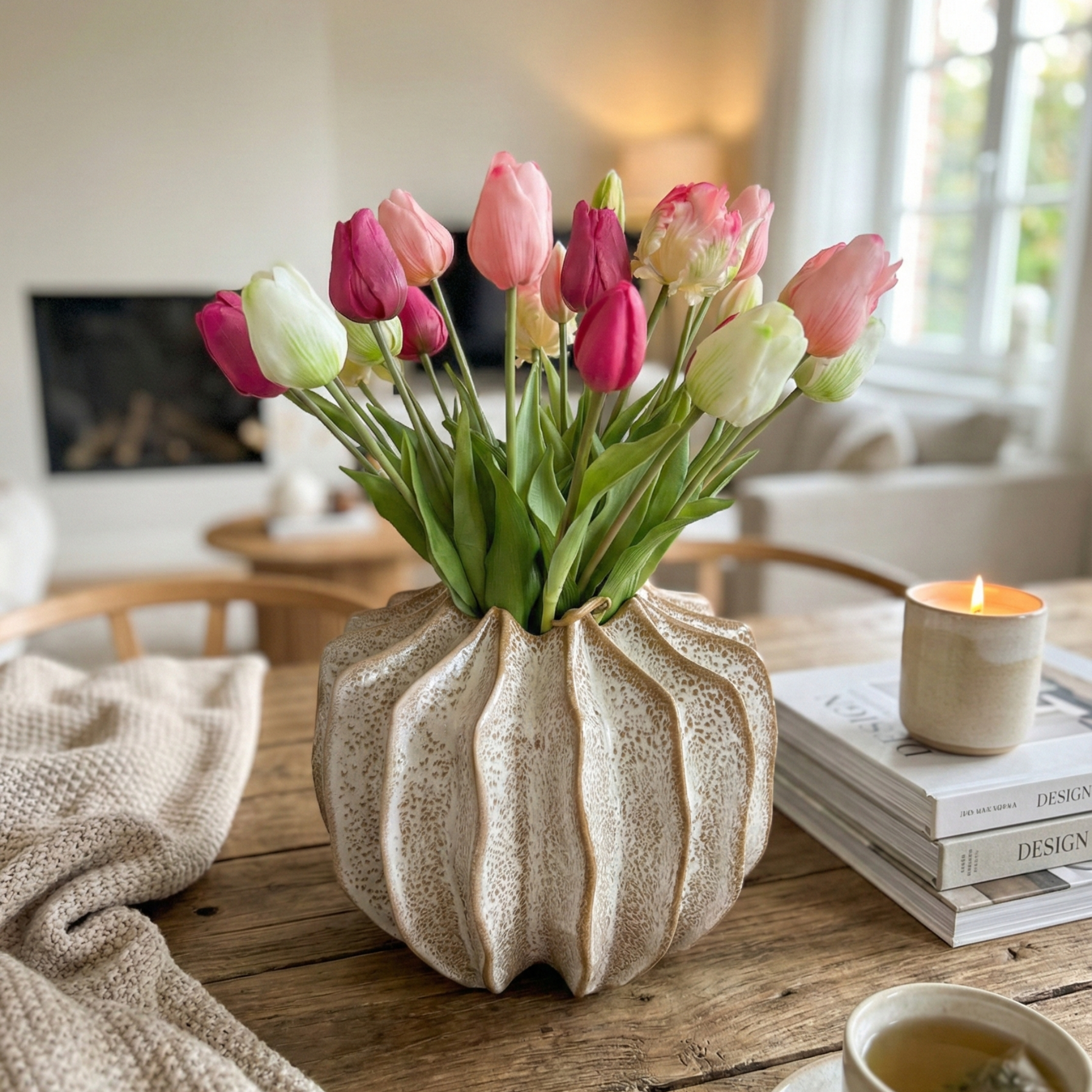 Deze keramieken vaas heeft een bijzondere vorm en een warme zandkleur. Door zijn brede model (30 cm doorsnede en 25 cm hoog) is hij perfect voor op een eettafel. Hij is niet te hoog, dus je kijkt er makkelijk overheen. De mooie golvende lijnen geven hem een speels en natuurlijk uiterlijk.
