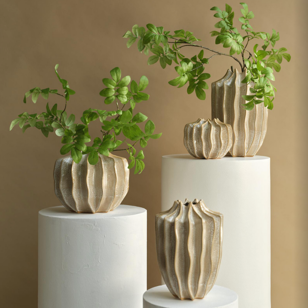 Deze keramieken vaas is 37 cm hoog en heeft een warme zandkleur met een mooie golvende vorm. De licht glanzende afwerking en het speelse patroon geven de vaas een unieke uitstraling.