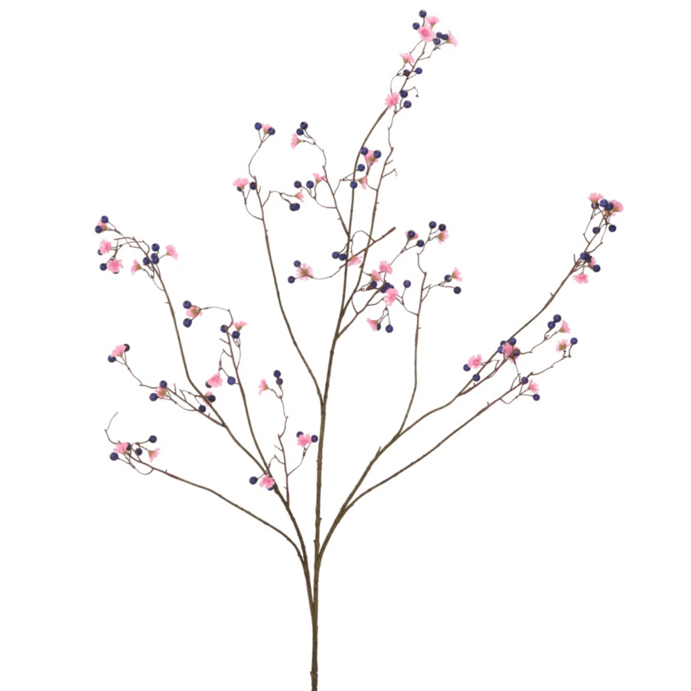Deze mooie grote kunsttak heeft blauwe besjes en roze bloesemtjes, wat hem vrolijk en kleurrijk maakt. Hij past goed in elk seizoen – van voorjaar tot najaar. Zet hem in een vaas op tafel, op de vensterbank of combineer meerdere takken in een groot bloemstuk.