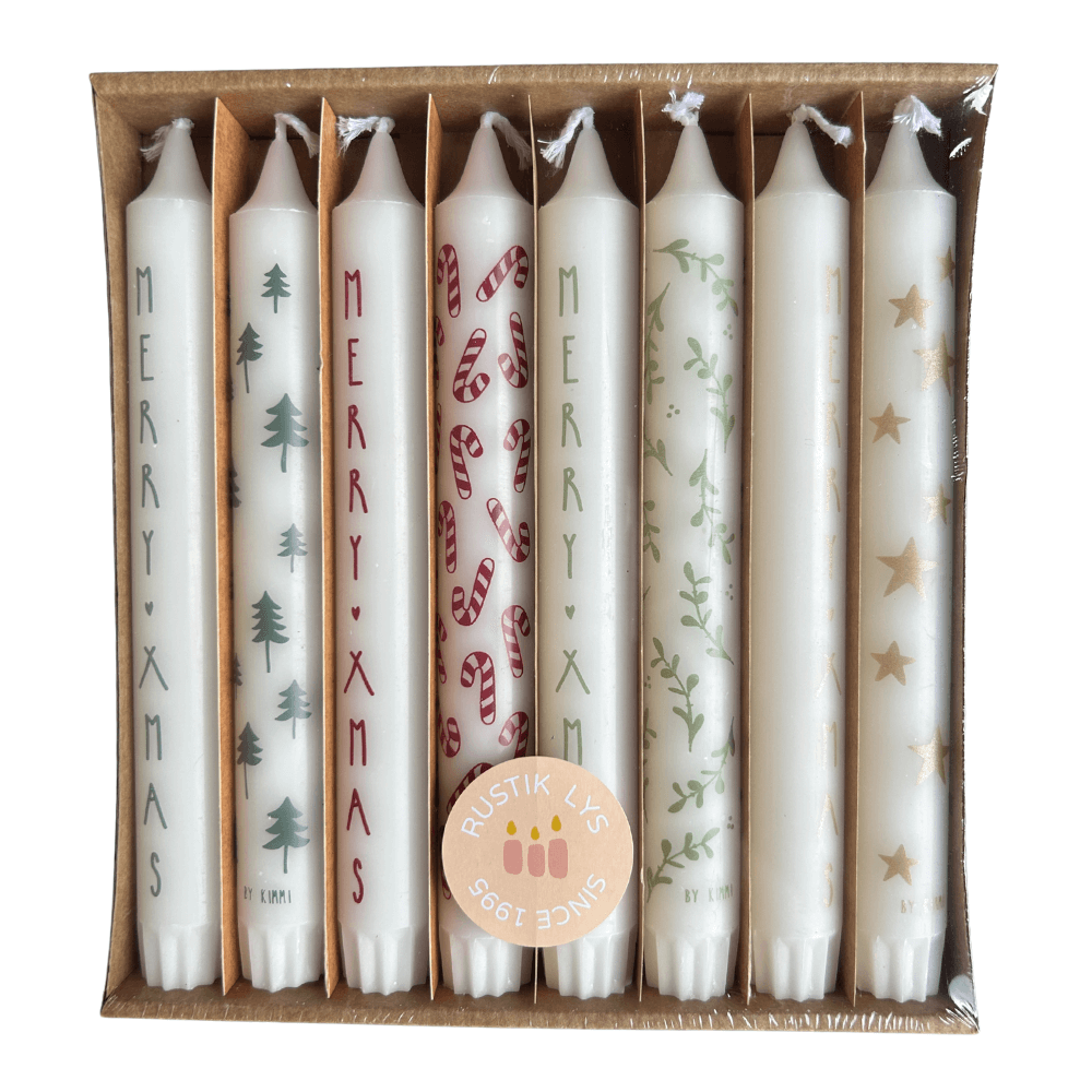 Dit Merry Christmas kaarsenpakket is perfect om je huis in feestelijke sferen te brengen. De doos bevat 8 dinerkaarsen, elk met een vrolijke kerstprint. Denk aan sterren, kerstboompjes, candy canes en natuurlijk de tekst Merry XMAS.