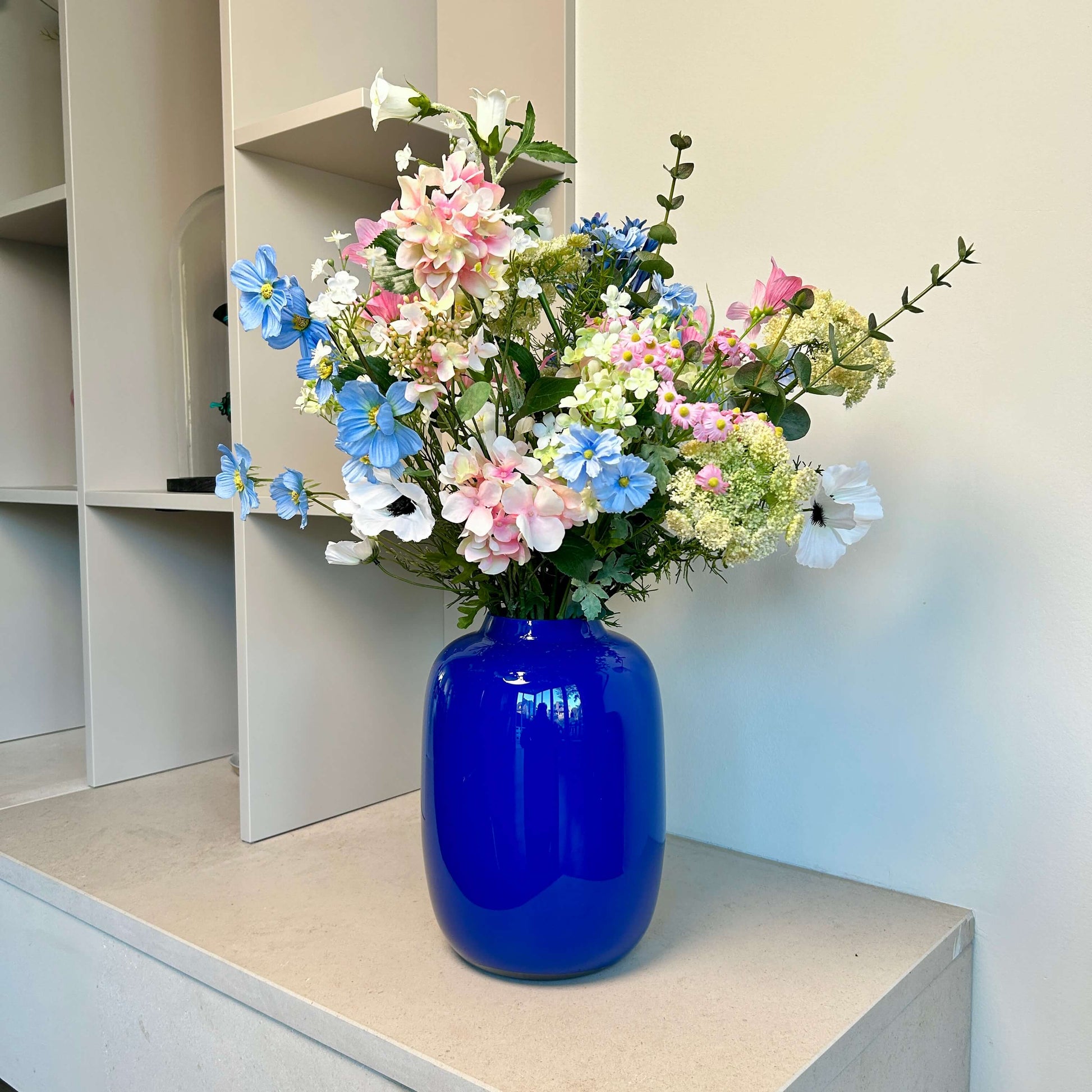 Gebruik de vaas voor een vrolijke bos verse bloemen of ga voor zijden bloemen uit onze grote collectie. Wat je ook kiest, het staat altijd sfeervol! De vaas is er in twee maten: 35 cm voor lange bloemen en 29 cm hoog.