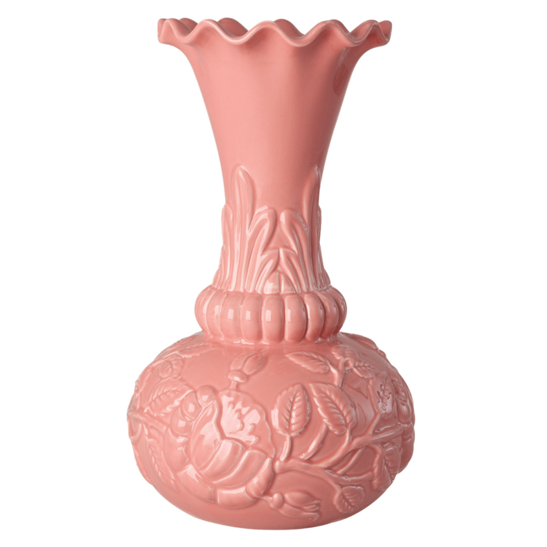 Deze Koraal vaas van het merk Rice heeft een bijzondere uitstraling: een klassiek model met een frisse, moderne look. De vorm doet denken aan een oude vaas van vroeger, maar door de glanzende afwerking en de diepe groentint voelt hij helemaal van nu. De subtiele reliëfdetails geven de vaas net dat beetje extra, zonder dat hij te druk wordt.
